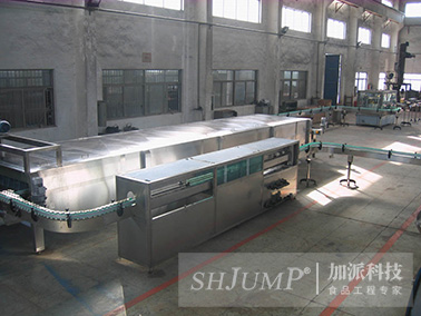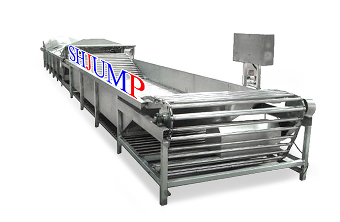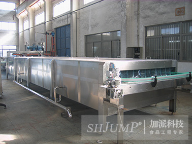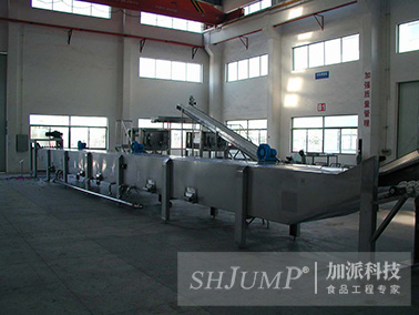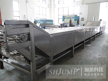 The machine is made of SUS304 stainless steel and heated by steam or heat conduction oil.  The upper and lower parts of the equipment are equipped with a net belt to ensure that the material soaked in the ironing pool, the equipment is equipped with a circulating pump to make the ironing pool water flow up to ensure that the water temperature in the pool uniform.  The tank body of the blanching pool is provided with an insulation layer to reduce heat loss.  The upper end of the equipment is provided with a steam outlet from which excess waste gas is discharged.  The upper cover is provided with a lifting device to facilitate internal cleaning, and the lower end is provided with a sewage outlet to facilitate equipment cleaning.  After blanching, the material is transported to the cooling pool for cooling through the net belt.