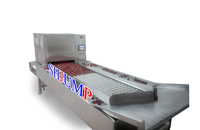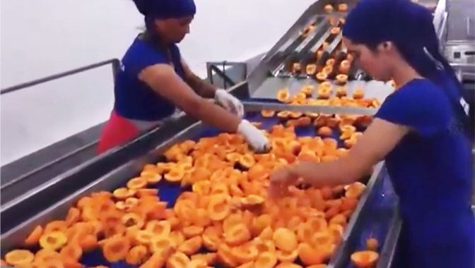 去皮、漂洗 將桃片核窩向下均勻地單層平鋪于燙堿機(jī)鋼絲網(wǎng)上,使果皮充分受到堿液沖淋。堿液濃度為6%~12%,溫度為85~90℃。處理時(shí)間為30-70s,隨后用清水沖凈堿液。