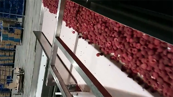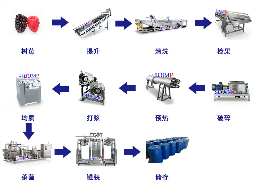 本生產(chǎn)線包括原果的提升系統(tǒng)、清洗系統(tǒng)、分揀系統(tǒng)、破碎系統(tǒng)、預(yù)熱滅酶系統(tǒng)、打漿系統(tǒng)、分離系統(tǒng)、酶解系統(tǒng)、過(guò)濾系統(tǒng)、 真空濃縮系統(tǒng)、殺菌系統(tǒng)、無(wú)菌大袋灌裝系。本生產(chǎn)線也可用于黑莓、藍(lán)莓、草莓等多種水果。