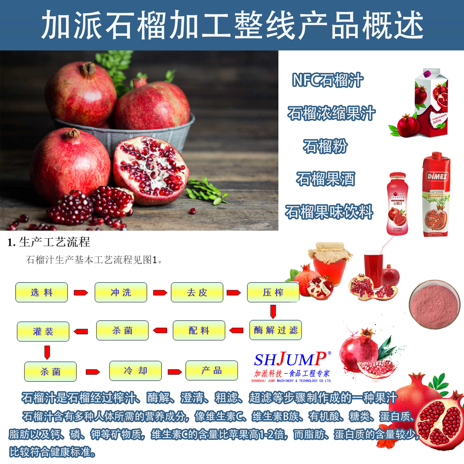 石榴→選料→沖洗→去皮→壓榨→過(guò)濾→配料→殺菌→封蓋→貼標(biāo)→成品