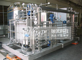 本機組主要由物料系統(tǒng)、高溫熱水系統(tǒng)、真空脫氣機系統(tǒng)(可選)、高壓均質(zhì)系統(tǒng)(可選)、CIP清洗系統(tǒng)、自殺菌無菌系統(tǒng)(可選)及控制系統(tǒng)等系統(tǒng)組成。管式和板式殺菌機的加熱管結(jié)構(gòu)有所不同。